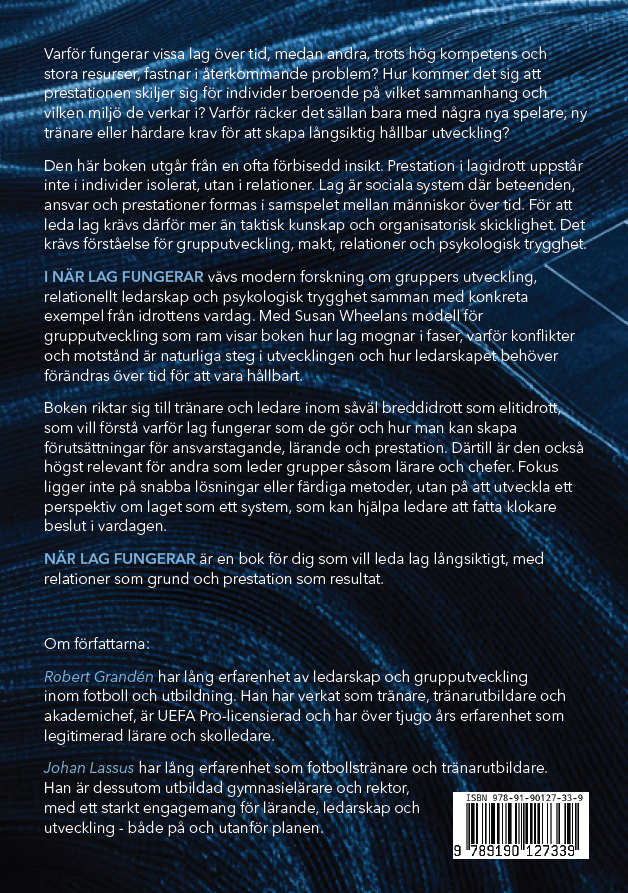 I NÄR LAG FUNGERAR vävs modern forskning om gruppers utveckling, relationellt ledarskap och psykologisk trygghet samman med konkreta exempel från idrottens vardag. Med Susan Wheelans modell för grupputveckling som ram visar boken hur lag mognar i faser, varför konflikter och motstånd är naturliga steg i utvecklingen och hur ledarskapet behöver förändras över tid för att vara hållbart.